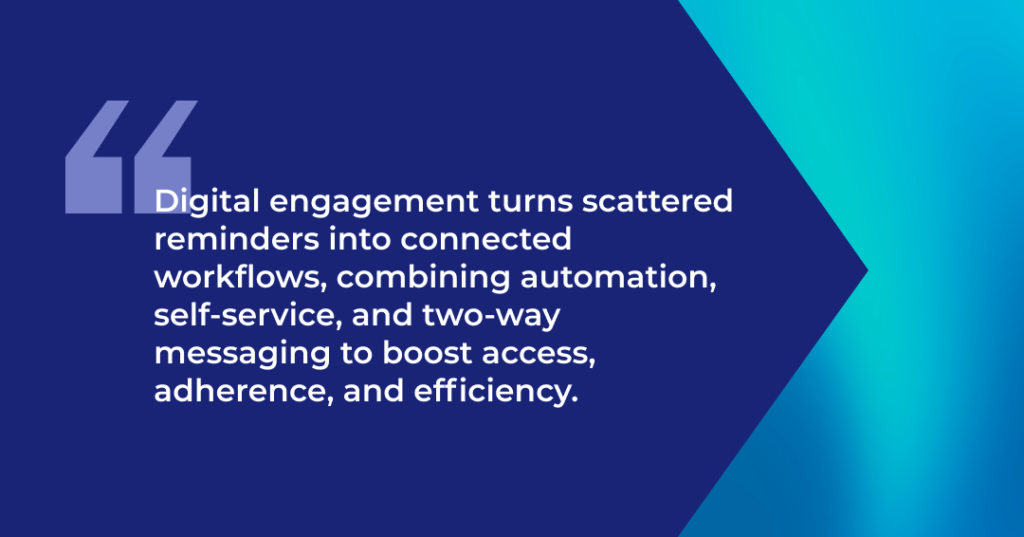 Digital patient engagement strategies address these gaps with consistent communication outside phone calls. Automated reminders reduce missed appointments. Self-service scheduling shortens the path to care. Two-way messaging handles simple requests without staff involvement. These workflows keep access moving without adding pressure to already stretched teams.